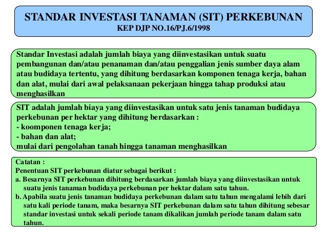 Penentuan njop pada hutan tanaman akan memperhitungkan standar investasi tanaman (sit). Standar investasi tanaman (sit) perkebunan kep djp no.16/pj.6/1998 sit adalah jumlah biaya yang diinvestasikan untuk satu jenis tanaman budidaya perkebunan per hektar yang dihitung berdasarkan : Pendahuluan tanaman cengkeh (syzigium aromaticum) merupakan tanaman perkebunan/industri berupa pohon dengan famili myrtaceae.