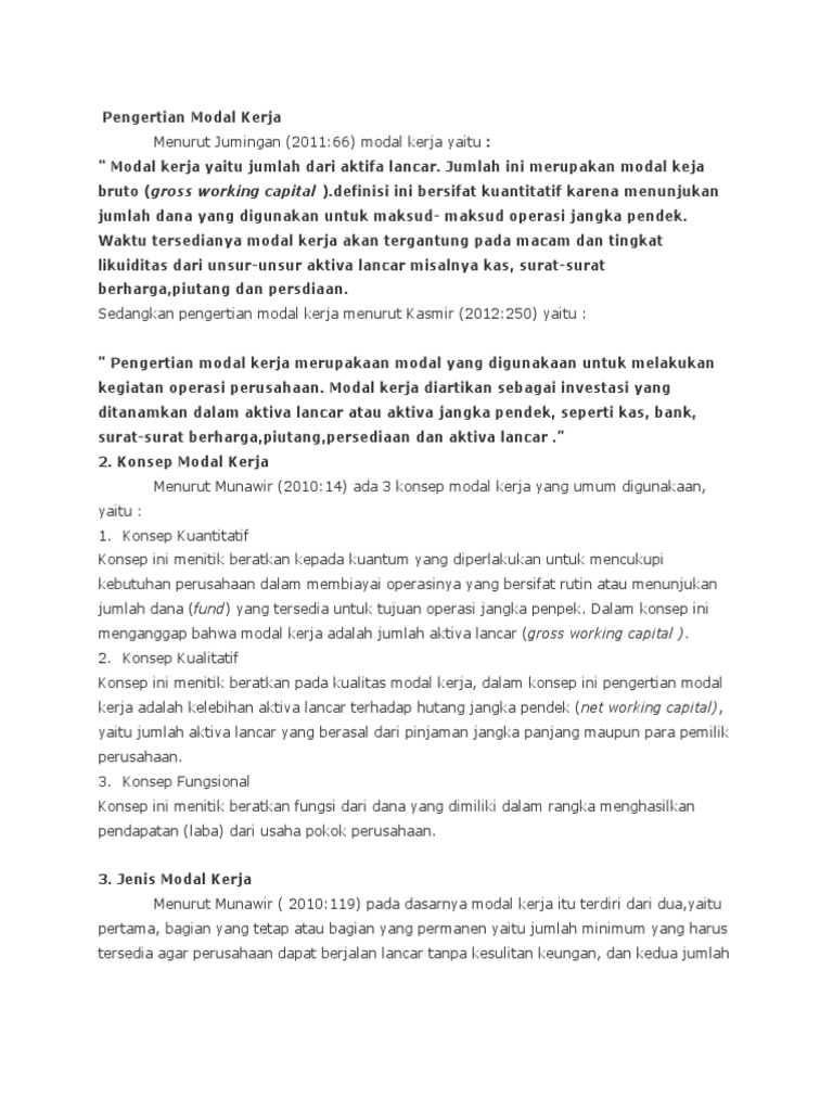 Modal merupakan salah satu faktor terpenting dari kegiatan produksi. Pengertian modal kerja menurut para ahli. Banyak ahli memiliki pemaparan tentang modal kerja yang secara garis besar memiliki kesimpulan serupa.